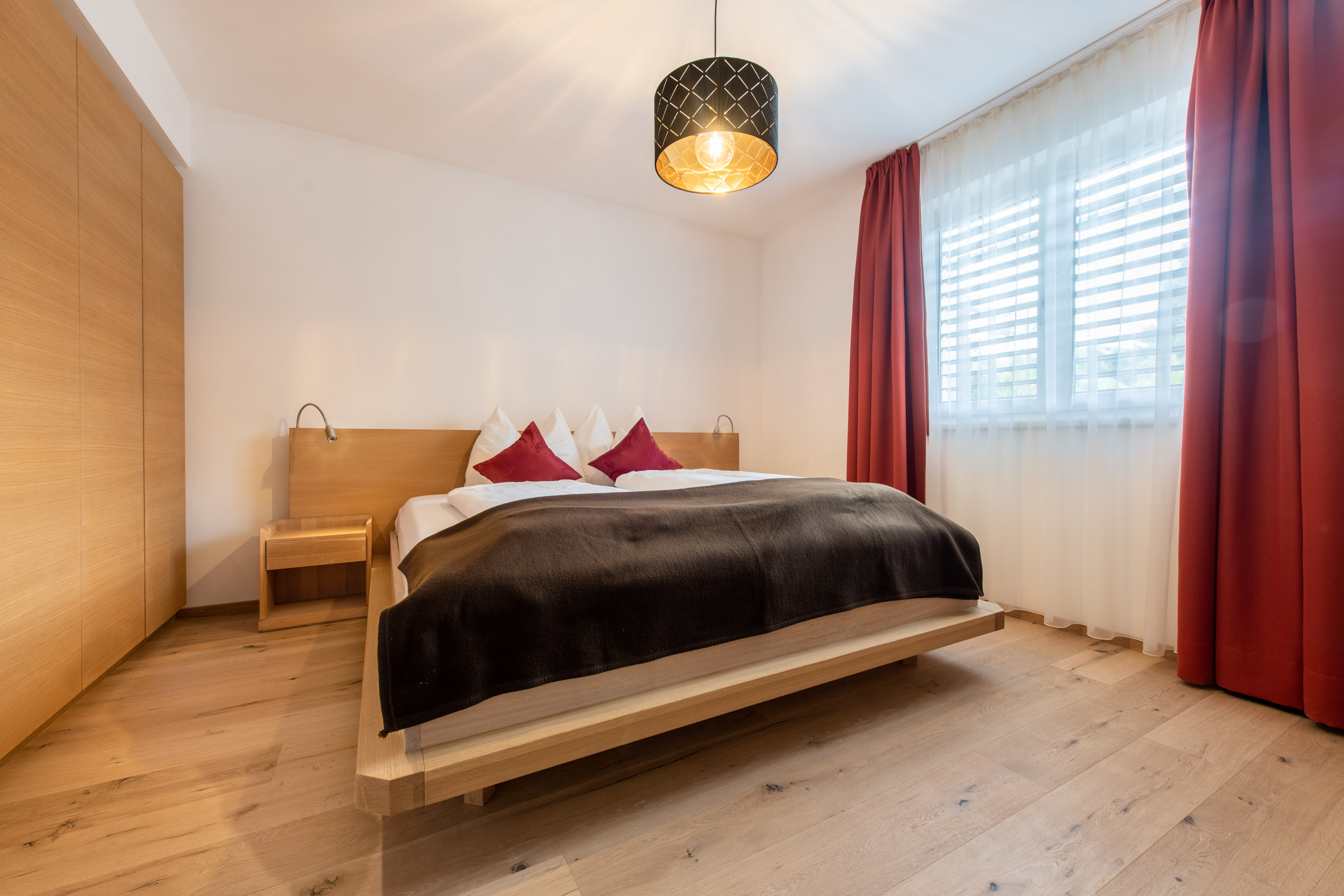 2 getrennte Schlafräume mit Doppelbett, Eichenholz-Böden, privater Platz mit Sitzgruppe vor dem Appartement, 1 Badezimmer mit Dusche /WC, Bidet, Badewanne, Fön, Kosmetikspiegel, 1 zweites getrenntes WC, Wohnraum mit Sitzecke, Doppelschlafcouch, Schlafsessel, digitaler Flachbild-SAT-TV, komplett ausgestattete Küchenzeile mit Kühl-Gefrierschrank, Spülmaschine, Mikrowelle, Kaffeemaschine Americano, Pad-Kaffeemaschine, Espressokocher, Wasserkocher, Bettwäsche und Handtuchservice. Nichtraucher