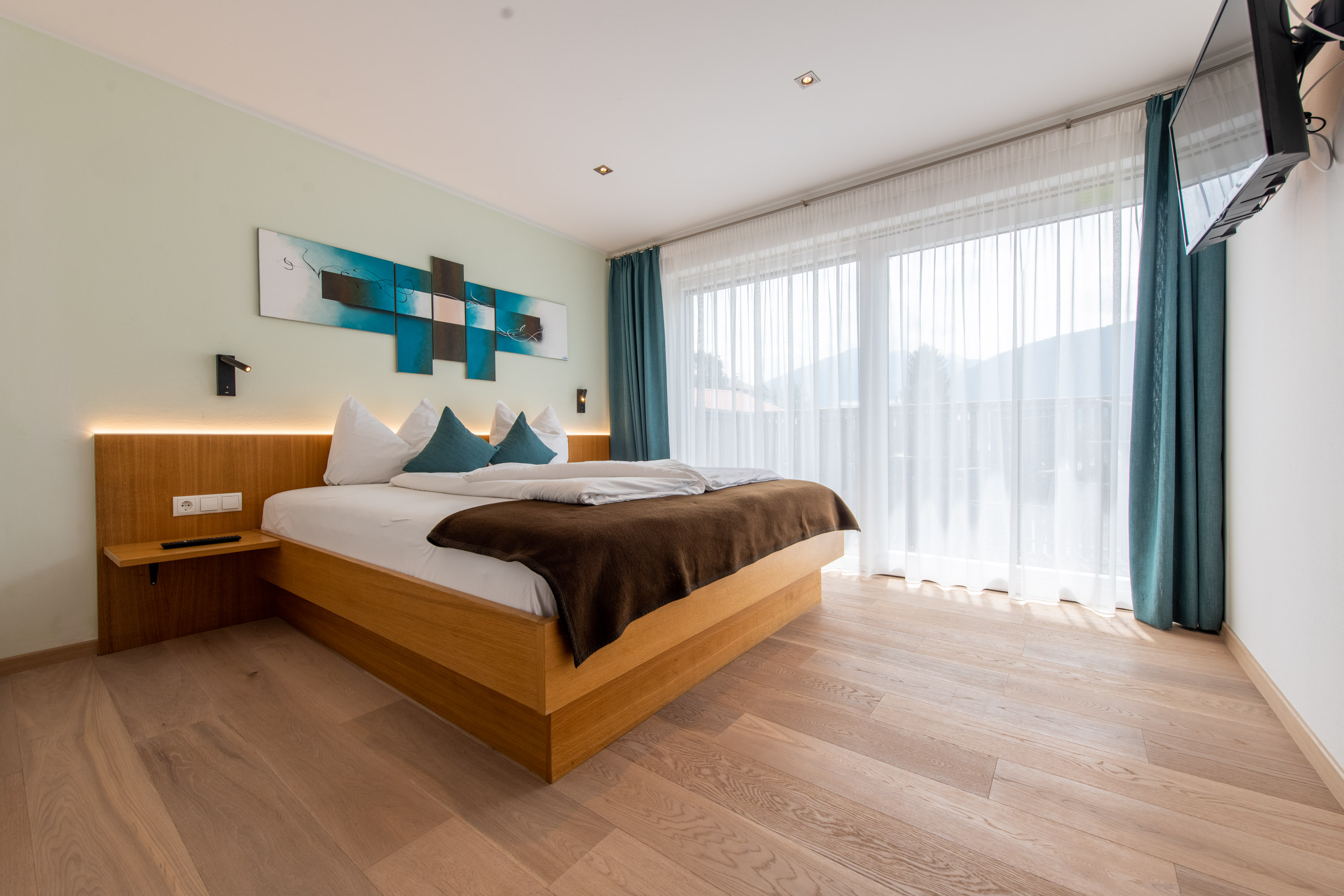 1 getrennter Schlafraum mit Doppelbett, Etagenbett neben dem Schlafzimmer (abtrennbar durch Schiebetür), Eichenholz-Boden, 2 Südbalkone mit Panoramablick, Badezimmer mit Dusche /WC, Bidet, Fön, Kosmetikspiegel, Wohnraum mit Sitzecke, Doppelschlafcouch, digitaler Flachbild-SAT-TV, Internet& DAB+Bluetooth-Radio, komplett ausgestattete Küchenzeile mit Kühl-Gefrierschrank, Spülmaschine, Mikrowelle, Kaffeemaschine Americano, Pad-Kaffeemaschine, Espressokocher, Wasserkocher, Bettwäsche und Handtuchservice. Nichtraucher