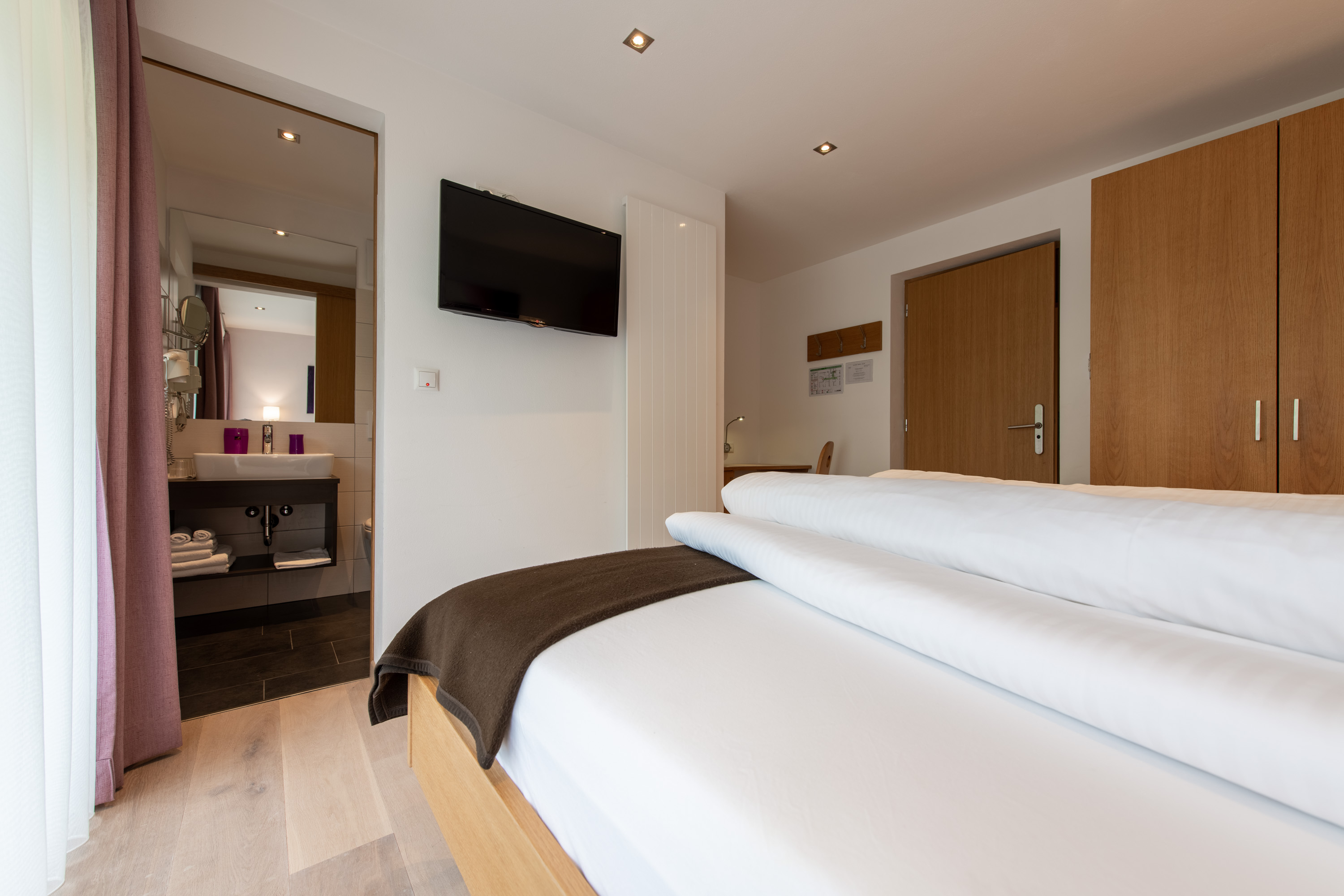 Doppelzimmer mit Westbalkon mit Panoramafenster und Raffstore (Bachseite), Eichenholz-Boden, Dusche /WC, Fön, Kosmetikspiegel, Schreibtisch, Frigobar, digitaler Flachbild-SAT-TV, Bettwäsche und Handtuchservice. Nichtraucher